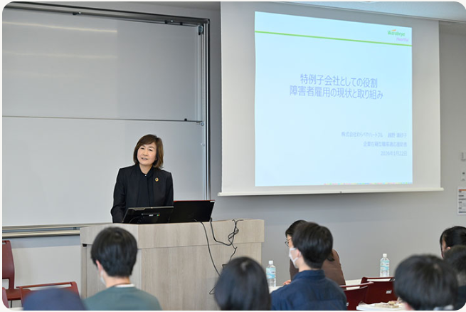 2026年1月22日、文教大学東京あだちキャンパスにおいて、「障害者雇用と教育現場での理解促進」をテーマとした講演会が開催され、越野社長が障害者雇用の現状や同社の取り組み事例について講演しました。